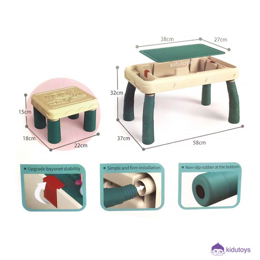 Spesifikasi: Berat 2342gr, Ukuran P: 75cm L: 40cm T: 9cm, berat volume : 5kg, terdiri dari : lego, 1 kursi anak dan 1 meja anak, usia 3 tahun+.