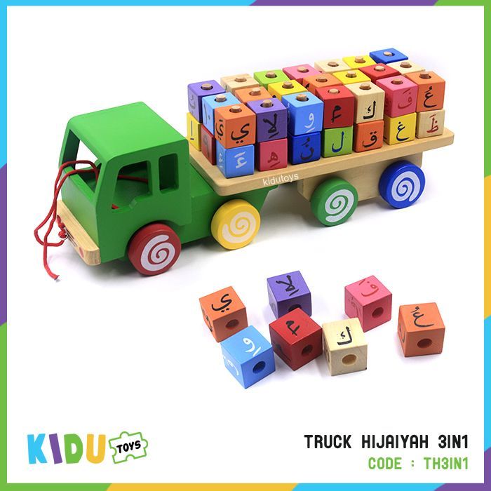 Sepesifikasi: Berat 2300gr, ukuran P: 38cm L: 18cm T: 12cm, usia 3 tahun+, terdapat Huruf Hijaiyah, terdapat satu buah mobil kayu isi 43pcs.